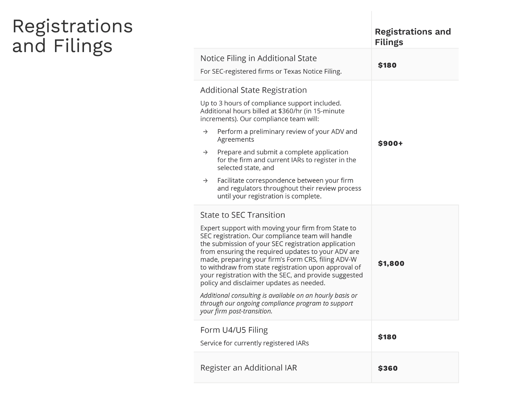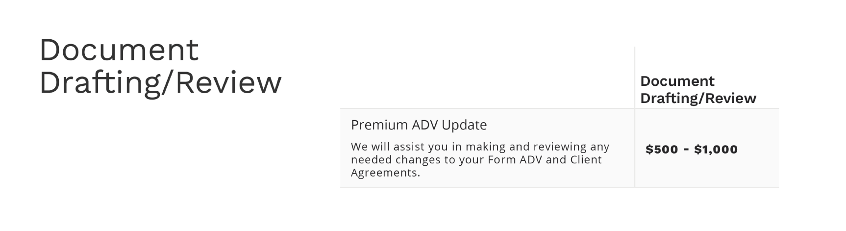 Need a second set of eyes or support from the Compliance Team on changes to your firm's documents? Our team will step in to support updates to Form ADV (Parts 1, 2A, 2B, CRS, and Wrap Brochures), updates to applicable advisory client agreements, and creation of new ones with the addition of new services (additional fees may apply).