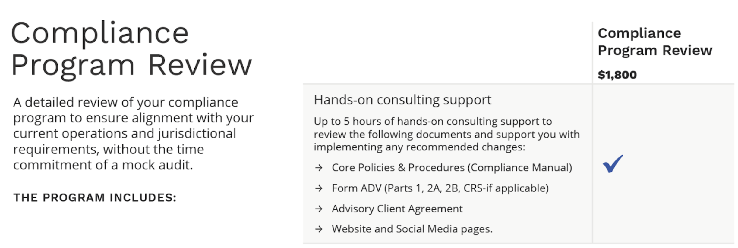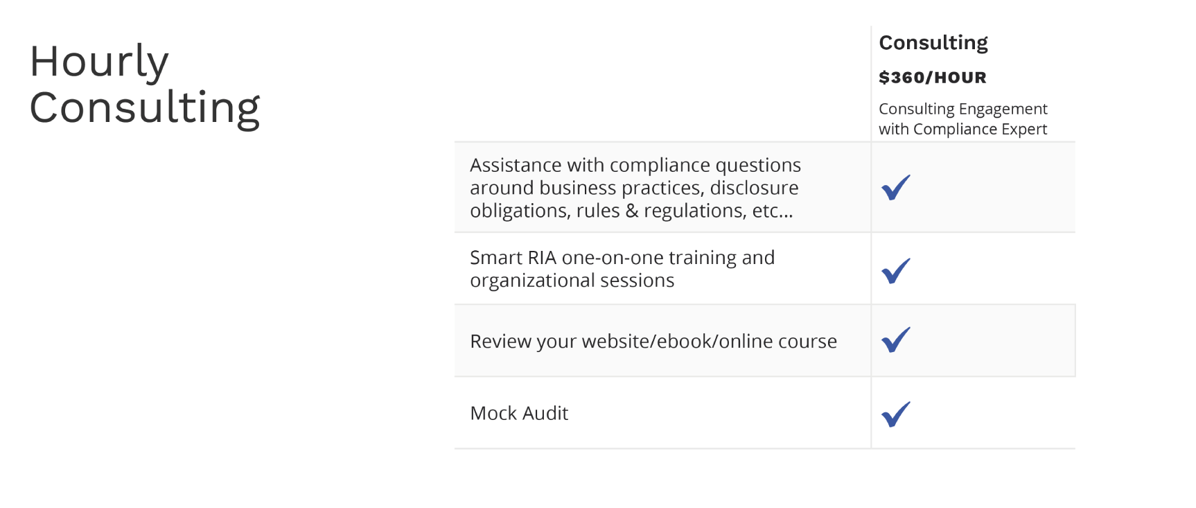Includes, but is not limited to: Assistance with compliance questions around business practices, disclosure obligations, rules & regulations, Smart RIA one-on-one training and organizational sessions, review of your website/ebook/online course, and Mock Audit corrections.